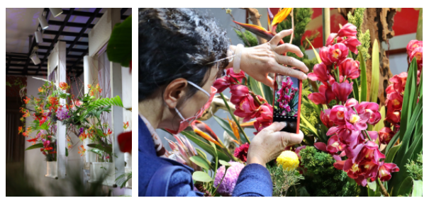 雨林之中,嘉木繁荫,蝴蝶兰如同探春之翼,翩跹曼舞其间,勾勒春之华盖;穿过海芋广场的兰花拱门,可见雾霭缭绕,烟岚如缕,各色兰花悠然栖居梢头,仿若藏匿在幽深的世界;空中花园的布置,在树上做出水滴造型,加入万代兰、洋兰,充满梦幻与生机。在这样柔美的空间里,1200株各色蝴蝶兰,1800株石斛兰、大花蕙兰、文心兰,1500盆凤梨、海棠、红掌,2000袋孔雀草、四季海棠,都如同听闻了春声的召唤,在葱茏茂密的雨林中演绎花之盛典。