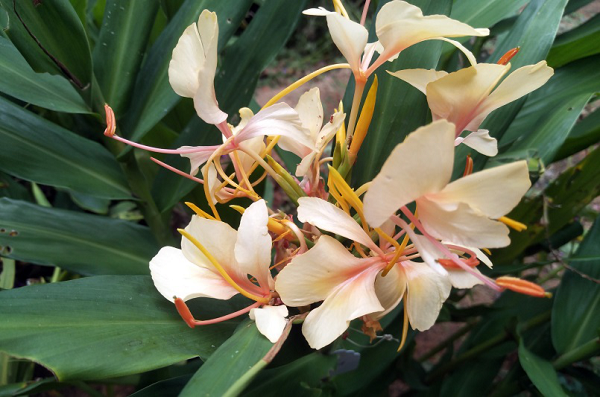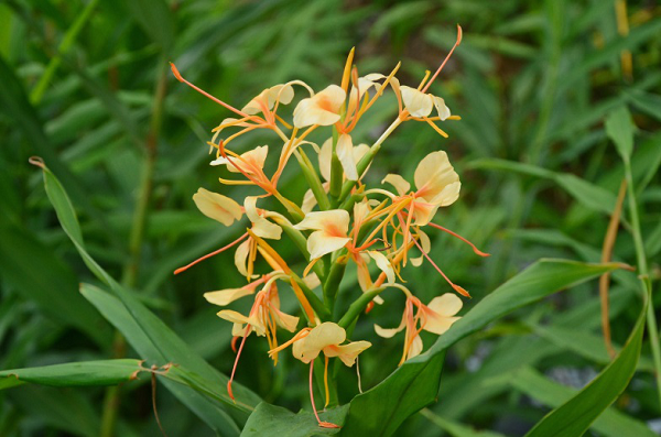 ‘霓裳’姜花植株较低,株高与母本姜花接近。‘霓裳’姜花整个花序有多种颜色,唇瓣、退化雄蕊等宽大伸展,具有淡雅芳香,有较高的观赏价值。