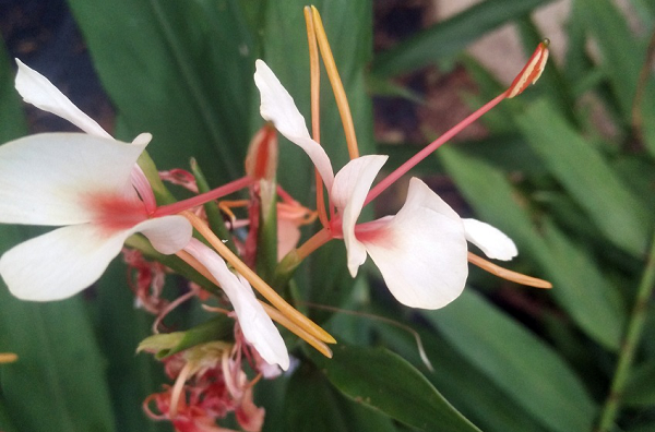 ‘香绯’姜花的花色为渐变色,其唇瓣大部为白色,花丝绯红,花初期的唇瓣和退化雄蕊基部是红色,至花后期整朵花渐变为绯红色,这种艳丽的渐变色,与父母本相比具有极高的观赏价值。