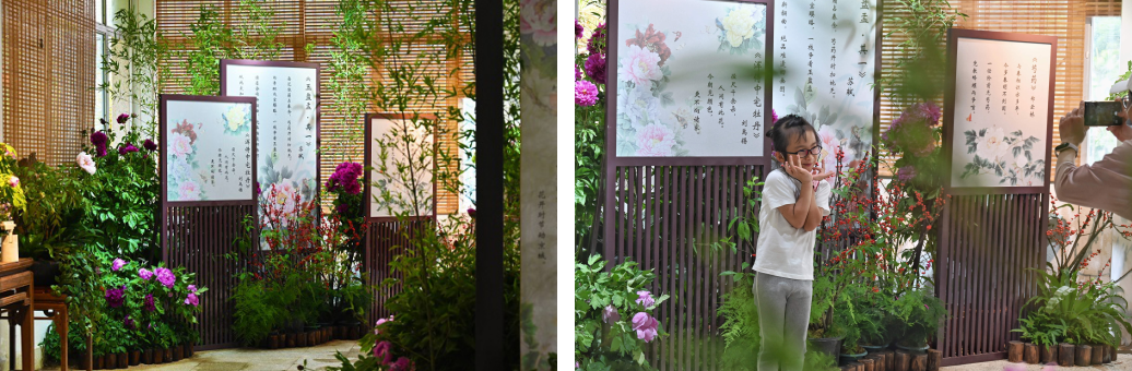 待月楼上结合古诗词文化,以牡丹、芍药诗词屏风将展馆分为两个空间,一面以山形小品结合牡丹芍药造景,一面以牡丹芍药为主,结合枯木作自然花境。展馆四周以诗词题板配以组合盆栽,再现文人赏花吟诗的风雅情景。含苞的诗情是一支蜿蜒的歌,盛放的画意是一道清浅的河,溯回诗赋,阅尽风雅,枕书而寐,眠中定有沉思:可爱深红爱浅红?