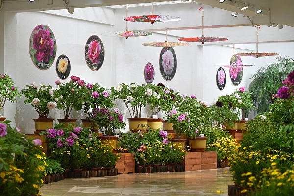 长廊馆为品种馆,展示了芍药与牡丹的精品品种,体现花卉品种的多样性及植物单体的个性之美。展馆中将牡丹和芍药沿着长廊布置,上层空间结合印有牡丹、芍药图案的油纸伞点缀丰富屋顶景观,整体呈现出“缤纷荟萃,各有千秋”的景象。黑色牡丹品种“黑豹”和“初乌”、绿色牡丹品种“春柳”以奇异的花色引来万千瞩目;太空芍药“黑海波涛”株高超群;荷兰进口芍药“御前表演”和日本进口芍药“红富士”亦在展馆中竞相展示自己独有的风姿。