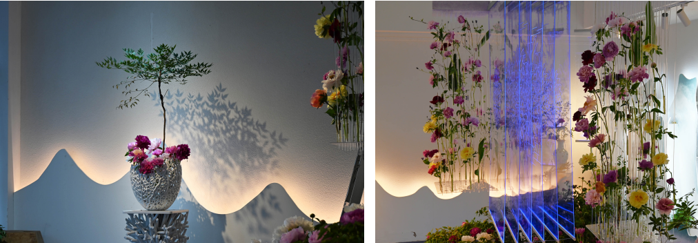 花艺馆以“花影·舞”为主题,采用多片雕刻着牡丹图样的亚克力板形成层叠效果,悬挂上百根亚克力条,将鲜切花布置其上,并通过LED灯条使光影与鲜花相交融。展馆中拂过明净的风,像是滤过世间尘杂,又如是纤纤素手编织成的一场酣梦,携着繁花拥抱流年,听得见花开的细语,听得懂流光的歌诗。横枝伸向一钩淡月,窥探昨宵是否有惊起的鸟雀,追问匆匆晚霞何曾稍作停留。在这一场疏影横斜,暗香浮动的邂逅中,只需沉浸。