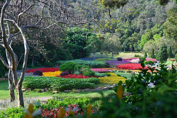 百花厅之外,园中各处亦是溢彩流光。在花卉园中,正举办“向阳花开”为主题的花展,以向日葵为主要花卉,展出“富阳”“光耀”“佛罗伦萨”等系列共11个品种的向日葵,此外还有“诗韵”和“彩虹糖”系列的金鱼草,以及“佳薇”系列新几内亚凤仙等各品种草花6万余株。金黄耀眼的向日葵与缤纷明媚的各色草花像是听闻了夏日初至的轻唤,同赴这场盛宴,将一袭华服披在山间,演绎着闲适的野趣。