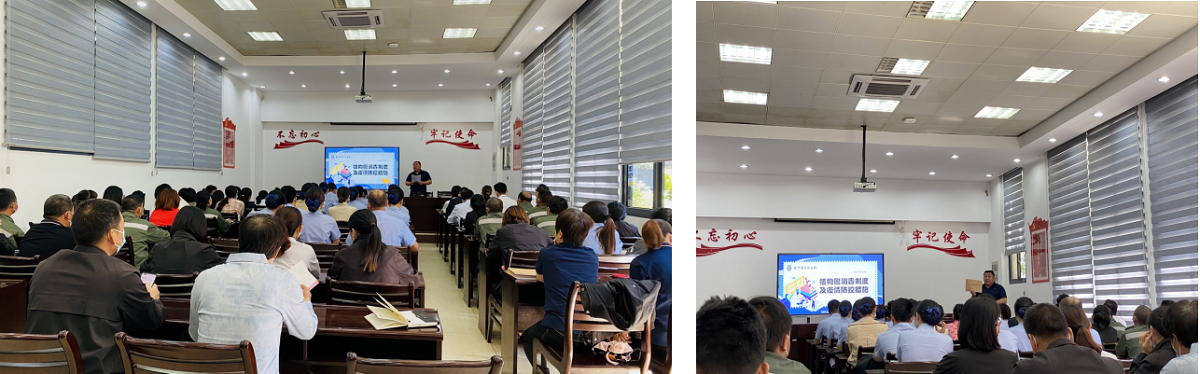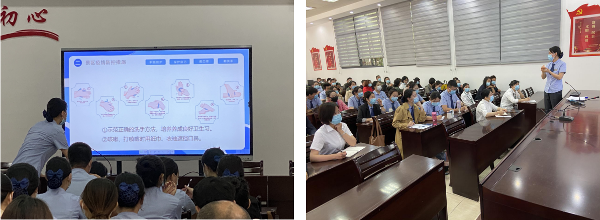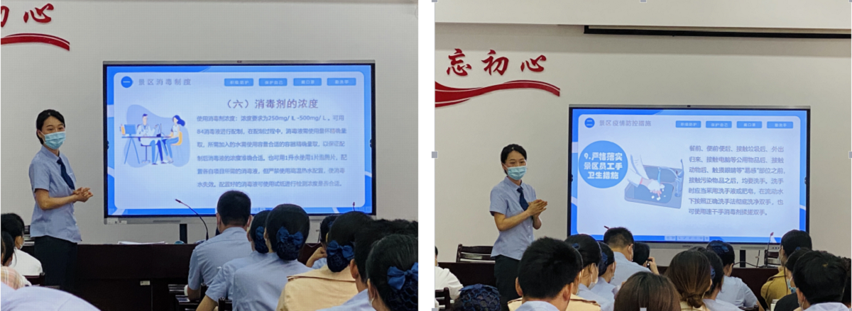 本次培训,讲师主要围绕景区消毒制度、景区疫情防控措施、出现疑似感染症状应对处置三个方面进行授课,针对常用消毒剂的种类、消毒液配制、预防性消杀流程、消杀部位的选择等进行了全面细致的讲解,现场进行演示并解答了学员的提问。