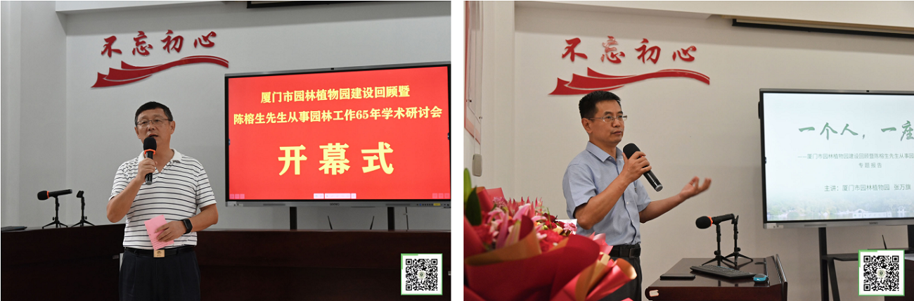 开幕式上,市市政园林局局长蔡伟中向陈榕生先生敬献鲜花,感谢他数十年来对园林事业的奉献。市风景园林学会理事长王亚平发言,指出此次研讨会旨在回顾植物园的发展和宣扬陈榕生先生的精神,对于今后园林绿化事业的开展有重要意义。市市政园林局副局长王伟军讲话,赞扬并感谢陈榕生先生带领一代代植物园人辛勤开垦,为植物园乃至厦门市的园林绿化事业无悔付出,并强调,陈榕生先生的精神值得每一位植物园职工传承,值得广大市政园林人学习和发扬。开幕式后的研讨会上,植物园主任张万旗做了关于植物园发展与陈榕生先生事迹的专题报告,介绍了在陈榕生先生的亲手耕耘和悉心指导下,植物园的发展历程和主要成就。紧接着,针对植物园优势植物种类之一的棕榈科植物,廖启炓研究员做了《棕榈科植物的研究与展望》学术报告,致敬陈榕生先生在棕榈科植物引种工作中的重要贡献。听闻陈榕生先生为植物园发展呕心沥血、为园林事业毕生奋斗的事迹,与会人员也分别发言表达了对他的敬仰与祝福,畅谈了各自在植物园建设以及园林绿化工作中的心得体会。