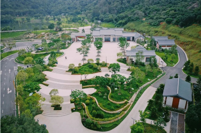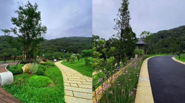 宽阔的车行道与无障碍通道就着山势向上延伸,线条灵动优美;道旁的缓坡是常绿灌木、观叶植物和护坡草皮装点的绿化带;搭配广场上正值花期的凤凰木、鼠尾草、红纸扇。从空中俯瞰,就像一双捧着鲜花的大手,将弧形花岗岩台阶与游人广场紧紧揽入怀中,彰显植物园开门迎宾的热诚与期待。