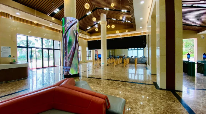 走进南门游客中心,咨询台、售票窗、检票闸口、水吧服务区等各功能分区一览无余、井井有条。一块LED柔性屏包裹了室内正中的圆柱,淙淙的溪水、雀跃的飞羽,就在眼前随着视频的滚动,似要绕柱而出,横生趣味。