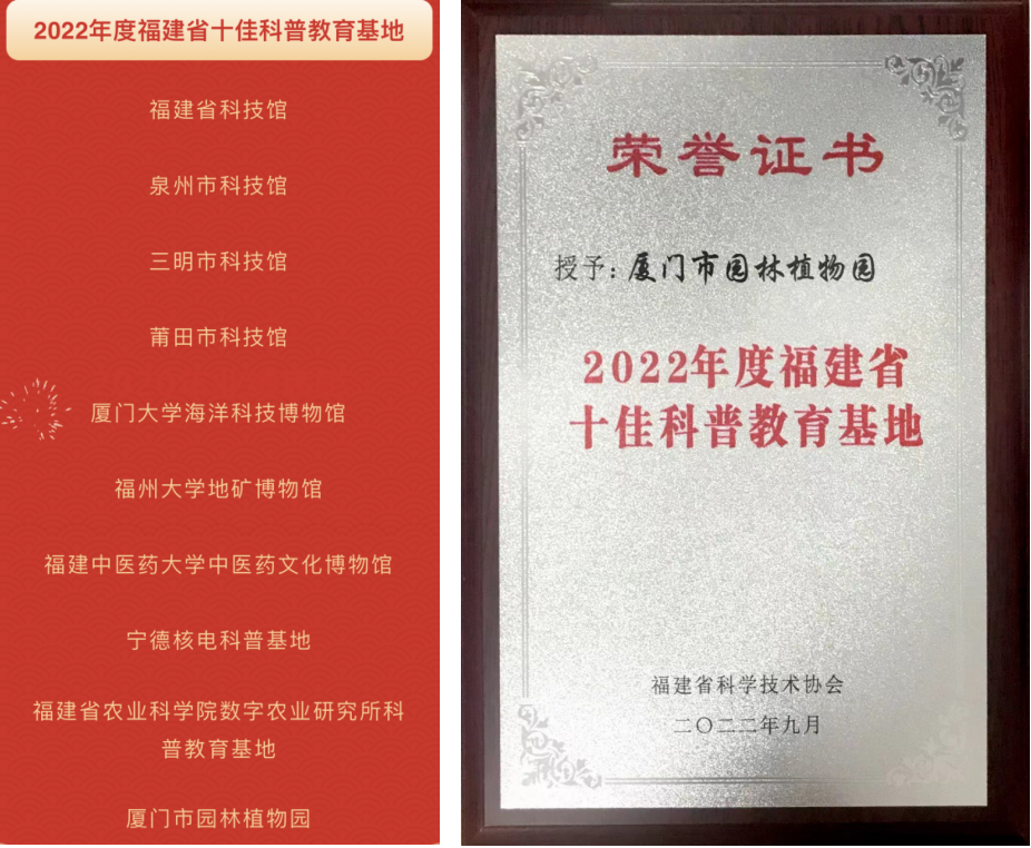9月14日,2022年全国科普日福建省主场活动在福州启动,并举行了“典赞·2022福建科普”发布仪式,正式发布了年度十佳科普教育基地、十佳科技辅导员、十佳科学传播人物。其中,我园荣获“2022年度福建省十佳家科普教育基地”称号。