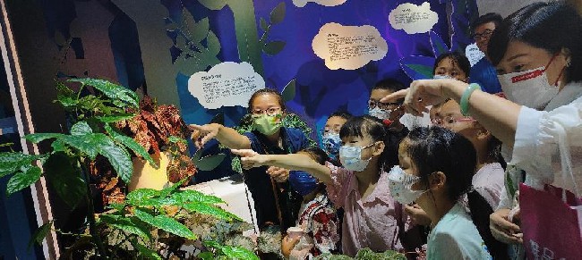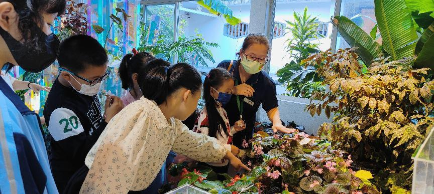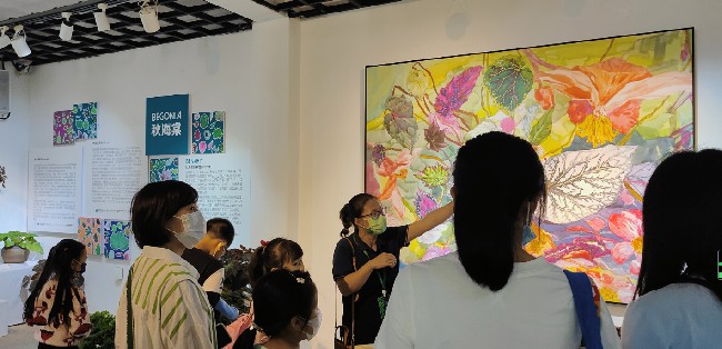 首先是厦门市园林植物园的老师通过问答互动的形式将小朋友带入展馆,主要以观察和触摸等方式,向小朋友讲解了秋海棠的原生境环境以及丰富多彩的叶形、叶色及斑纹。让小朋友在观察和比较不同秋海棠种类的叶子,较直观地了解不同种类海棠叶形的共同特征:整体轮廓呈斜心形。