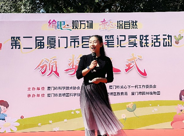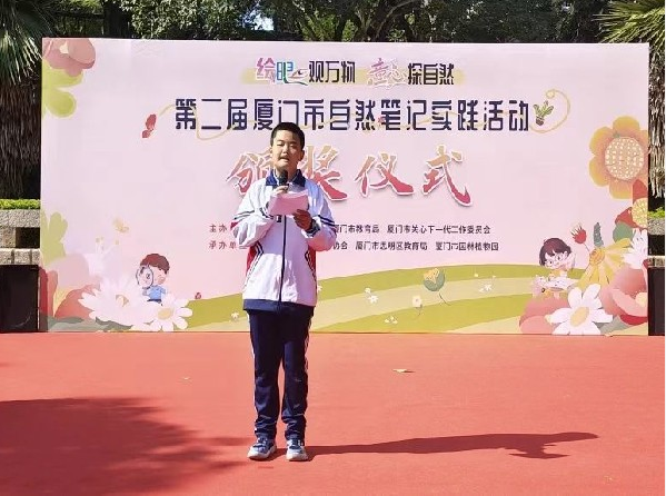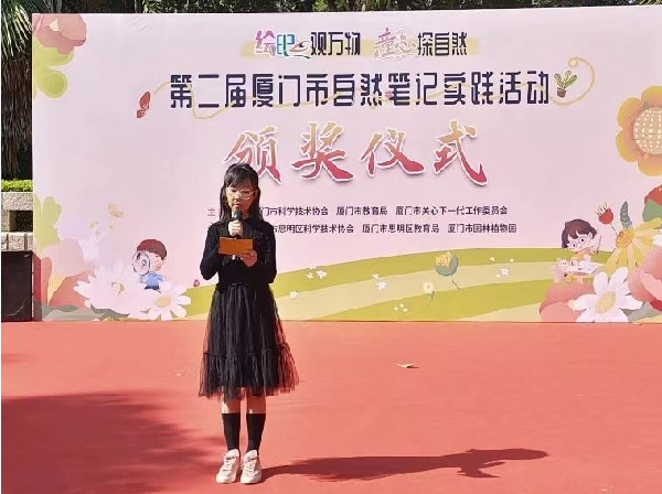 颁奖仪式上,来自厦门外国语学校附属小学的敬悄悄同学表示“唯有认真细致地观察才能更深入地了解植物特征,我将保持这样的方式在未来探索大自然各种奇妙的植物!”来自厦门市槟榔中学的许哲烨同学认为“自然笔记活动是我们克服‘自然缺失症’,步入大自然的良好平台,自然教育使我们在自然中感受生命的丰富和美好,让智力、情感、意志在自然环境中逐渐完善。”来自厦门市槟榔小学的卓雪琪老师将自然笔记创作过程中的心得和指导经验娓娓道来。她表示“这是一项非常有意义的活动,它不仅让我们更加了解自然,还提高我们的科学素养和艺术修养,在今后的工作中,我将继续积极探索和创新,为培养更多优秀的孩子努力奋斗。”