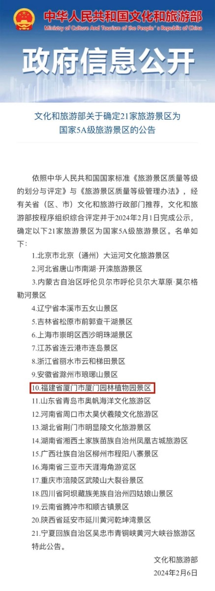 2024年2月6日,文化和旅游部发布关于确定21家旅游景区为国家5A级旅游景区的公告,厦门园林植物园景区名列其中。