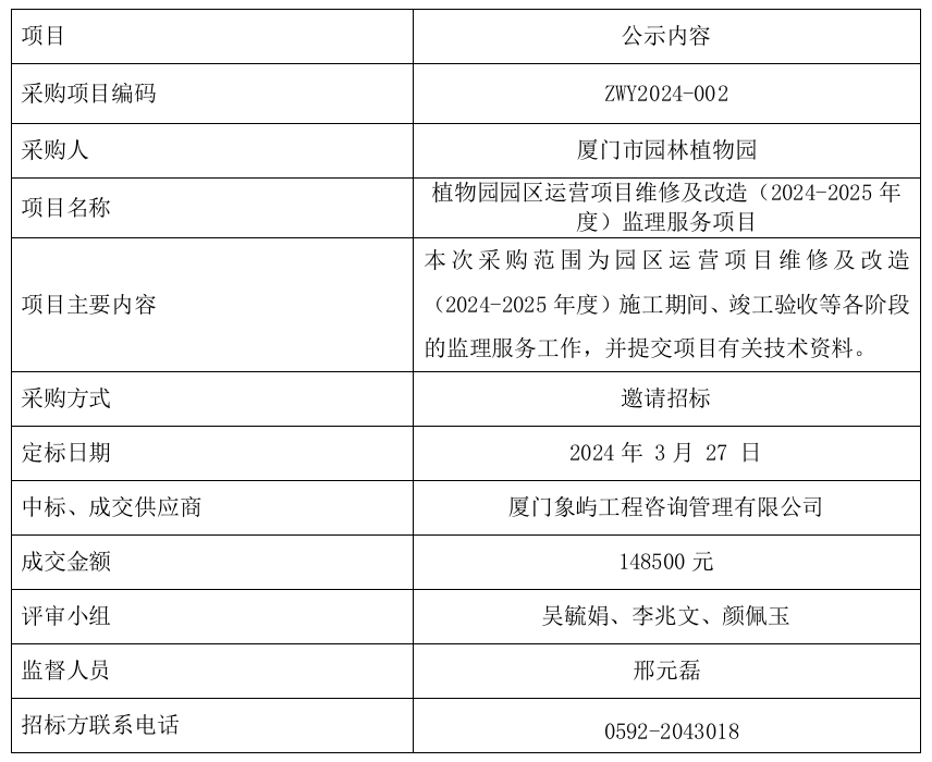 厦门市园林植物园 园区运营项目维修及改造(2024-2025年度)监理服务项目结果公告