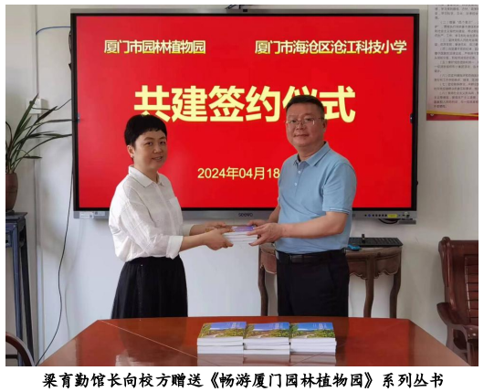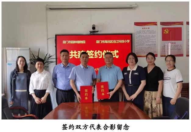2024年4月18日上午,我园与海沧区沧江科技小学举行共建签约仪式,蔡邦平副主任及沧江科技小学董建亮校长签署共建合作协议,尝试将自然教育和生命教育融入文化与课程,共同探索融合教育的新模式,为学生们探索自然、增强环保意识共同助力。沧江科技小学副校长陈美英、德育主任陈静菁,我园园林科研科科长陈松河、科普馆馆长梁育勤参加了签约仪式。