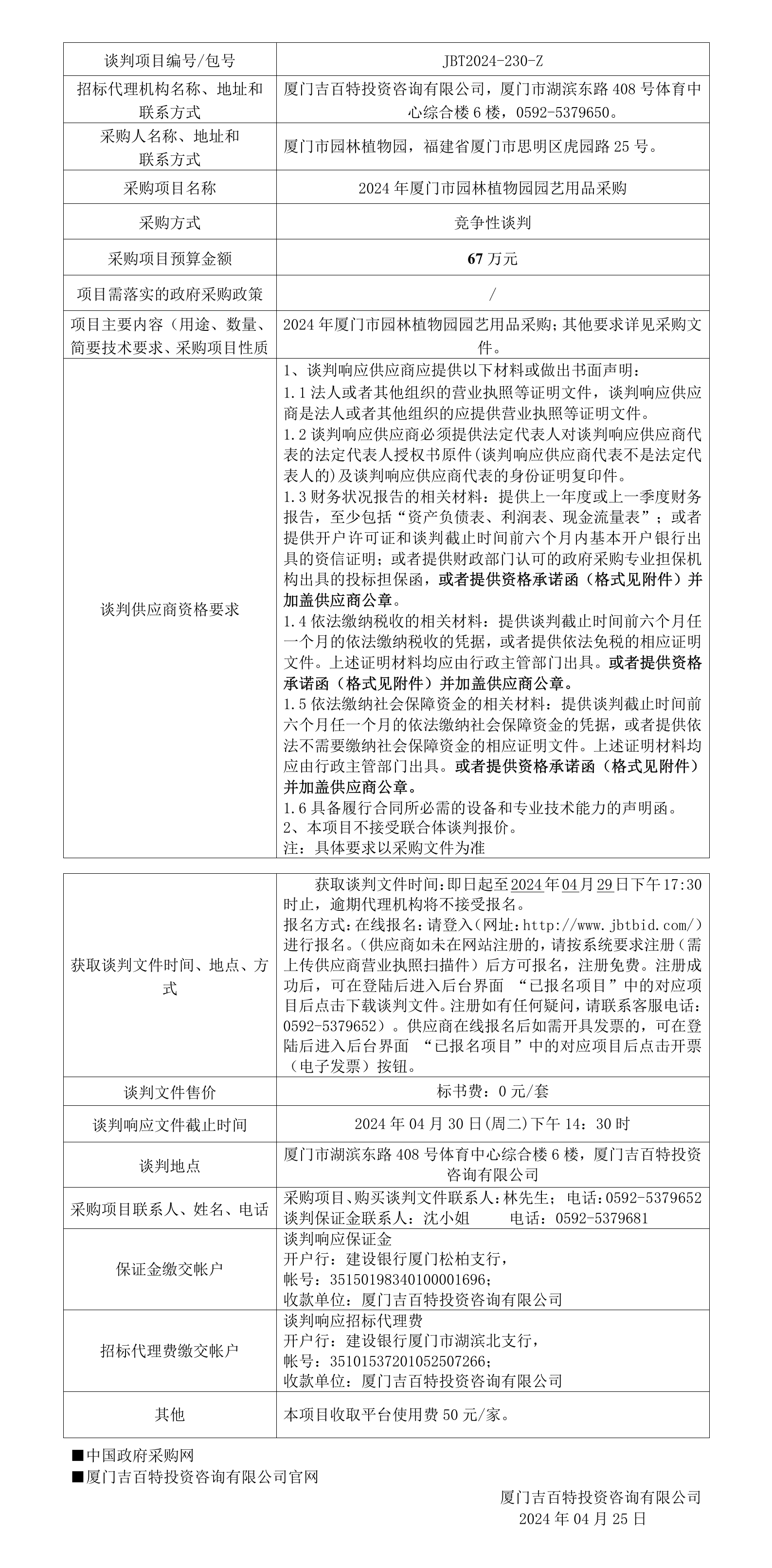 2024年厦门市园林植物园园艺用品采购谈判公告
