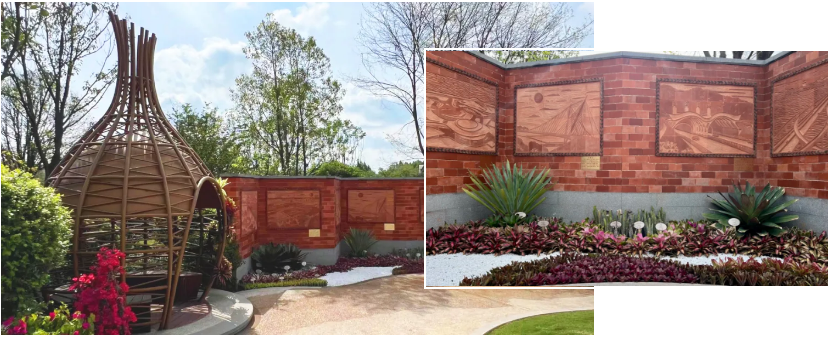 闽南建筑剪影式入口景墙以传统闽南红砖及石材为饰面材料,“渔篓”“渔笼”小品参照渔篓及蟹笼造型设计,运用钢管竹节烤漆型材,以现代手段再现海岛渔家风情。传统红色砖雕则采用现代工艺进行雕刻,雕绘福建省八个重点建设项目,展现近年来厦门城市建设与发展成就。