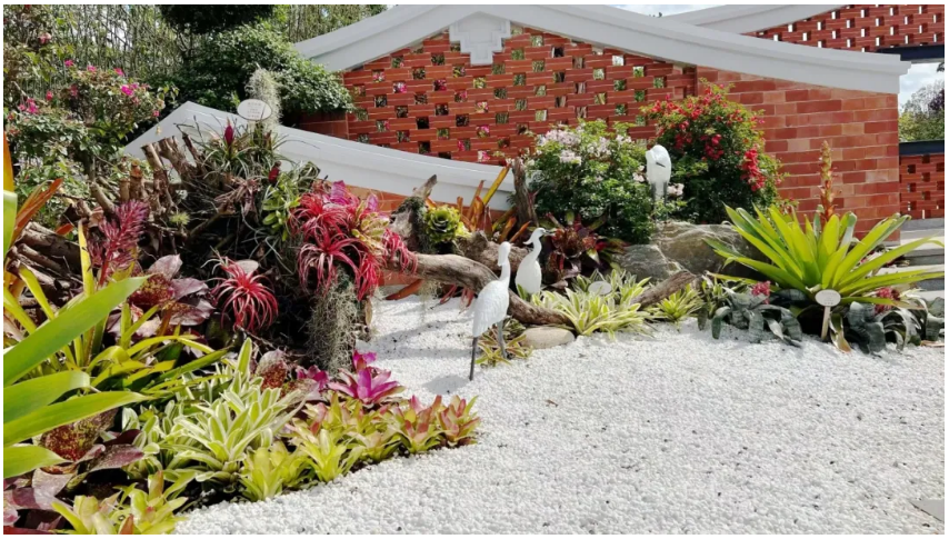 园内错落有致配植中东海枣、市花三角梅、竹类等植物,选用百余种叶色丰富、形态万千的积水凤梨和空气凤梨,营造富有椰风海韵风情的厦门南亚热带植物特色景观。
