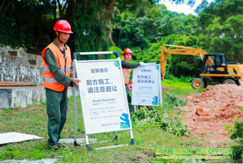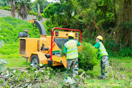 此次演练模拟了台风登陆我市后,造成园林绿化不同程度损害的场景,涵盖应急通信模拟演练、抢险区域安全警戒、受灾道路清障、乔木树枝整形修剪、乔木扶正加固、树枝破碎和垃圾清运等多项科目。