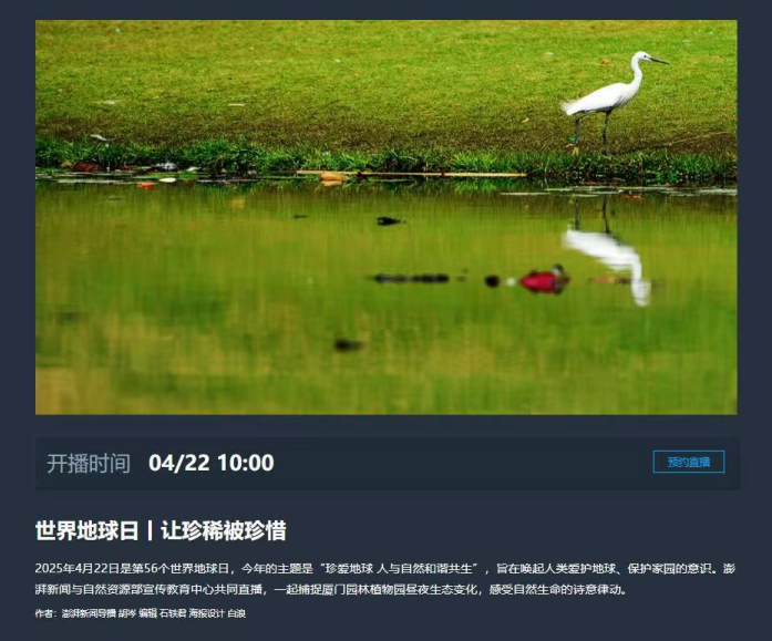 为提升活动影响力,本届“以诗之名·让珍稀被珍惜”公益行动联动天虹旗下全国98座购物中心LED大屏,保利影院全国50家剧院的LED屏,厦门站的LED屏,以及微博微公益、微博环保、凤凰网公益、华夏时报、社会与公益杂志、澎湃新闻、中国诗歌网等全国性媒体宣传渠道,形成立体化传播矩阵,确保公益理念触达更广泛人群。世界地球日当天,澎湃新闻就“让珍稀被珍惜”主题进行7 小时慢直播,旨在提高民众对珍稀物种保护的意识,促进人与自然和谐共生。