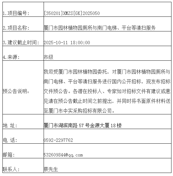厦门中实-招标预公告-[350201]XMZS[GK]2025050-厦门市园林植物园厕所与南门电梯、平台等清扫服务