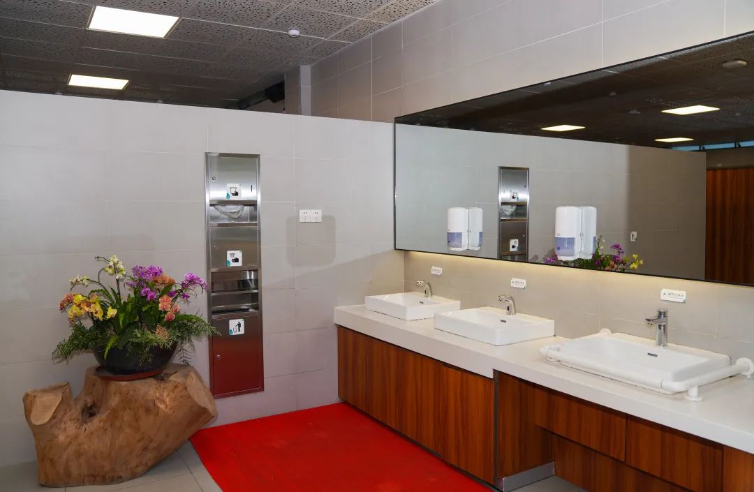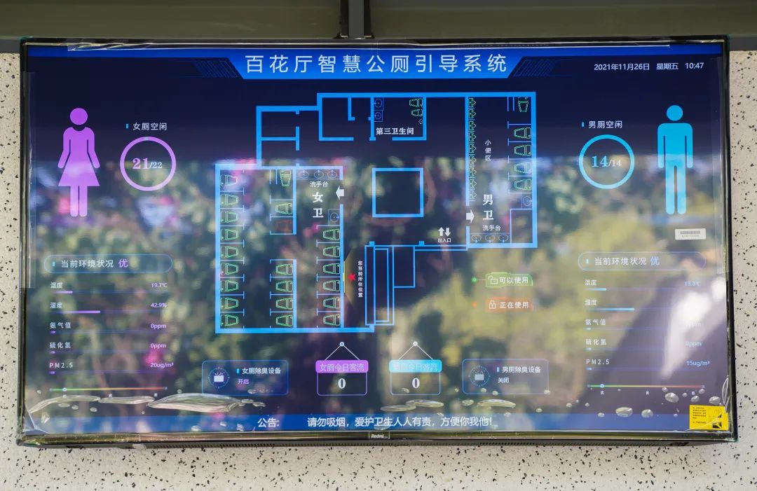 此外,为做好疫情防控工作,公厕内所有冲水、洗手设施都是感应式。洗手池上方的镜子都有灯光照明,到了夜间,使用起来也是暖意浓浓,男女厕位比例调整为2:3。