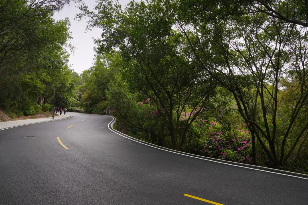 此外,在道路地势较高的转弯处,植物园也将护栏加高加固,白色栏杆配上黑色路面,很是养眼。