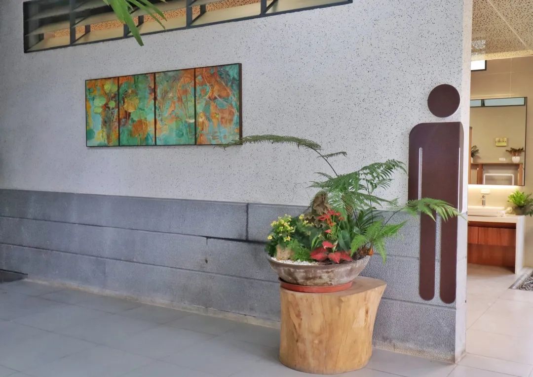 在画作布置上,精选了以植物园风景或花卉为题材的作品,配以精美画框悬挂于墙面,展现植物园的特色。