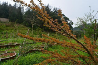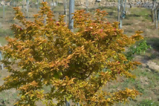 品种特点:该品种幼枝幼叶呈红色,尤其在秋冬时节温度较低时色彩呈红色较明显,群植时远望如枫林尽染,园艺观赏价值较高。