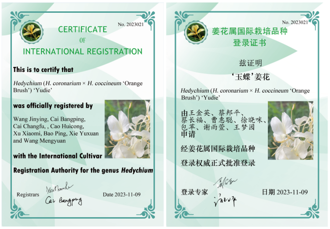 品种特点:该品种唇瓣深裂白色,略反卷;花丝及花药呈黄色;每朵小花比母本姜花更为离散;花后期花瓣逐渐转成黄色。因花色白,唇瓣略反卷似蝶形,故取名‘玉蝶’。