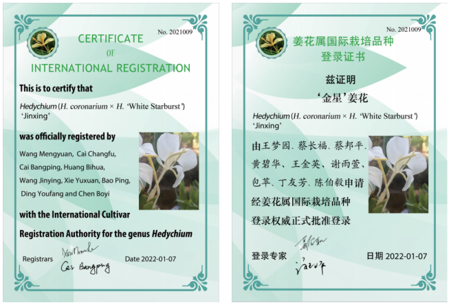 品种特点:该品种植株矮小、叶背被毛,与父本(‘星爆’姜花)有明显区别;花朵较大,花色淡雅,唇瓣大部白色,中央为金黄色;花丝中上部为黄色,基部白色。
