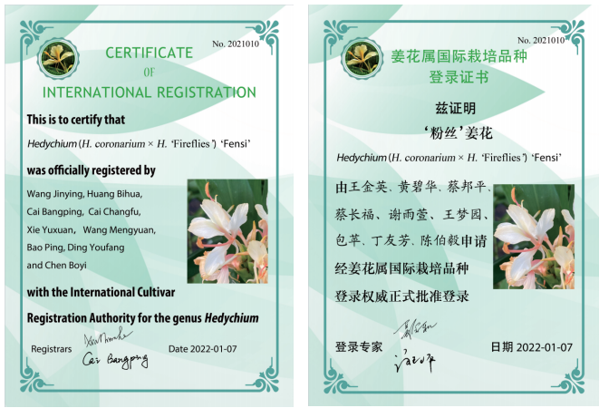 形态特征:‘粉丝’姜花株高约105.2cm,2年生植株假茎数7个,叶片形状为披针形,数量20片左右,叶片长和宽分别约为32.1cm、4.7cm,叶片颜色深绿,叶舌长和宽分别约为2.2cm、1.5cm。花序长11.45cm,花色由浅黄色向粉红色渐变;苞片卷筒状排列,每苞片小花数等3朵;花冠管长度4.64cm,花冠管伸出苞片长度1.44cm;花冠裂片长和宽分别约为3.31cm、0.32cm;侧生退化雄蕊形状为匙形,长和宽分别约为2.72cm、0.85cm;唇瓣近圆形,顶端深度开裂,主色为淡黄色,心部粉红色,长和宽分别约为2.56cm、2.24cm;花丝粉红色,长3.53cm;花药长度0.92cm;花香淡,花期夏秋季。