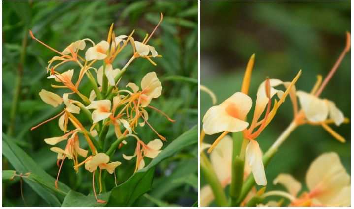 形态特征:‘百媚’姜花株高48.3-117.2 cm。叶片渐尖,19片左右,最长叶长29.5 cm,宽约4.3 cm。穗状花序顶生,长约14.4 cm,直径平均17.1 cm。苞片下半部覆瓦状排列,上半部卷筒状排列,苞片长3.2 cm左右。每苞片2-4朵小花,花色双色,主要为黄白色和橘黄色,香气淡雅。唇瓣深裂,黄白色至橘黄色,长约2.9 cm,宽约2.3 cm,瓣柄长0.8-1.0 cm;花冠裂片黄色条形,长约3.3 cm,宽约0.4 cm;花冠管黄色,约4.2 cm。侧生退化雄蕊黄白色至橘黄色,颜色与唇瓣相同;花丝橘红色,长约4.1 cm;花药红色,长约0.7cm;花香淡;花期夏秋。